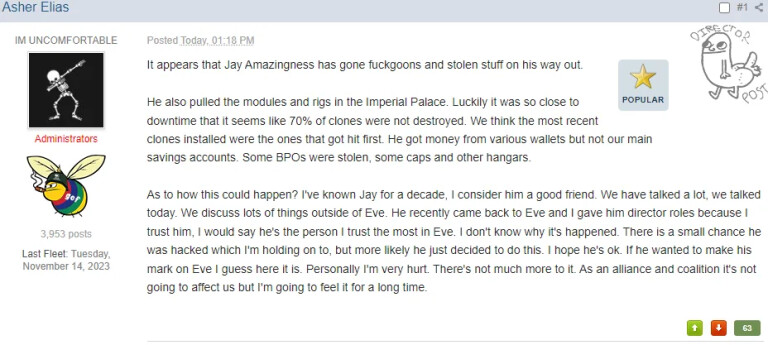 这是今年发生的事情。Asher邀请了一个多年前的老朋友进蜜蜂的执行军团,相当于WC的FRTBM,还给了部分总监权限。于是这个新总监大人上任的第一件事情就是把执行军团的机库洗了,然后拆掉了1DQ星城的克隆服务,导致1DQ内所有玩家的蛋蛋都炸了,光蛋蛋的损失就好几万亿 isk.