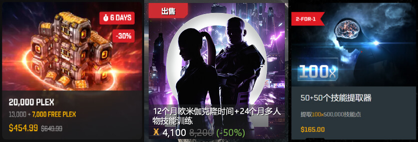 同时注意官方一年一刷新的新人礼包折扣。7折左右的铂金包,算上赠送的脑抽,实际只需660 PLEX 就可以充3个月,属于ISK充值PLEX折扣的最低点。折扣白银包同样非常划算。